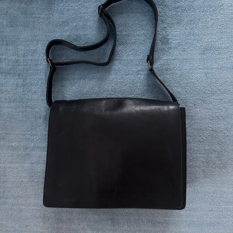 Nahkainen unisex-olkalaukku jossa on useita lokeroita ja lukittavat metalliklipsit. Sopii asiakirjojen ja muiden tarvikkeiden kuljettamiseen. Leveys 40cm, korkeus30cm. pohjan leveys 10cm. Erittäin hyväkuntoinen. Väri vähän tummenpi kuin kuvassa.