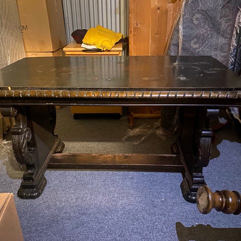 Akaasiapuinen pöytä viikinki kaiverruksilla.