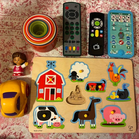 Palapeli ja juna, molemmat puuta. Junan toisesta vaunusta toinen rengas irti. Hinta yhteensä 8€