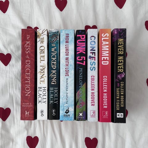 10 booktok kirjaa osa täysin koskemattomia lojunut vain kaapissa (All your perfects, Dance of Thieves, Girl in pieces ja The vampire Wish). Muut luettu joten jälkiä on mutta ei mitään suurta!