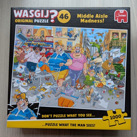 Jumbo Wasgij 9 Retro Home Improvements palapeli, jossa on 1000 palaa. Palapeli esittää retro-tyylisen kodin remontointitilanteen kuvan. Sopii palapelien harrastajille ja nostalgisista aiheista kiinnostuneille.