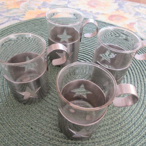 Pienet Iittalan glögilasit, viisi kappaletta, joissa teräksiset kahvat. Mukit ovat läpinäkyvää lasia ja niissä on erilliset metalliset kahvat, joissa on erilaisia kuvioita (tähti, sydän ym.). Sopivat kuumien ja kylmien juomien tarjoiluun.