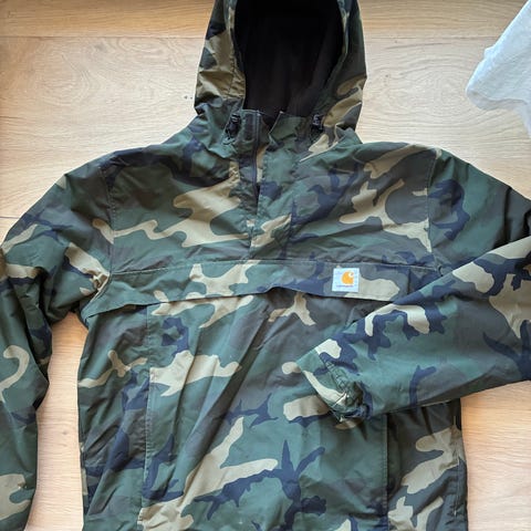 Carhartt Discovery Jacket -takki, koko L. Tuulitakissa on violetti ja keltainen väritys, huppu ja vetoketjusuljenta. Takki on 2000-luvulta (ehkä 2007) eikä ole ollut käytössä vuosiin. Kunto on hyvä. Nouto Kalliosta.