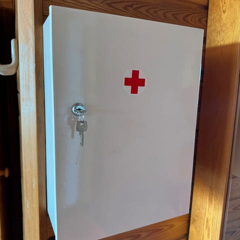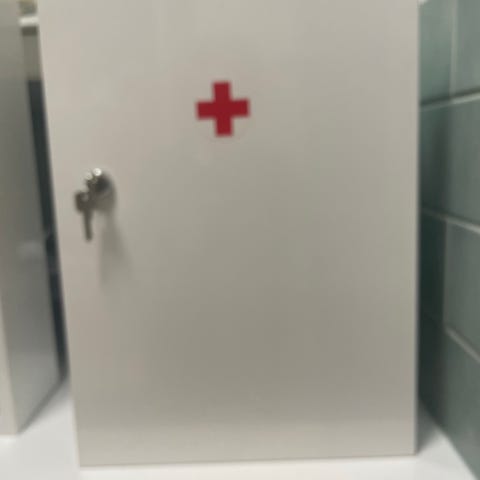 Kuvien mukainen lääkekaappi valkoisesta metallista. Kaapissa on useita osastoja ja hyllyjä ensiaputarvikkeiden säilytykseen. Ovien sisäpuolella on pidikkeet pulloille ja pieni vetolaatikko. Kaapin ovi lukittavissa avaimella.