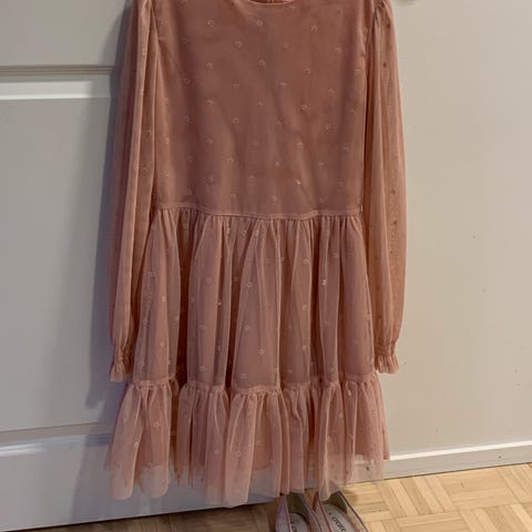 Selässä vetoketju. Koristenauha kiinni mekon saumassa.