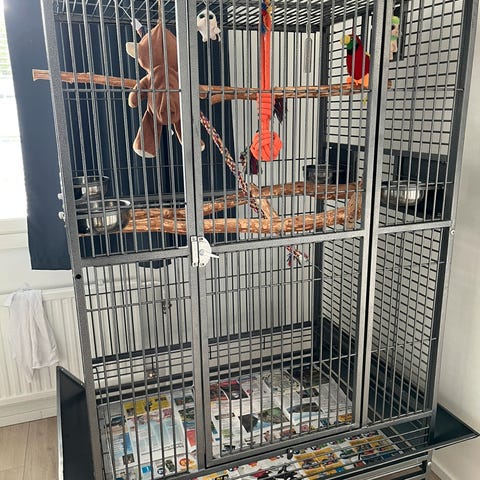 Käytetty lintuhäkki. Mukaan kolme ruokakippoa. Häkki purettuna tällä hetkellä.