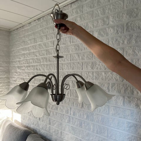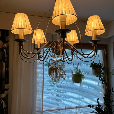 Kaunis musta-hopea valaisin kattoon prismoin. Lampussa paikat kolmelle polttimolle. Tällä hetkellä sokeripalaliitännällä, mutta voidaan vaihtaa pistokekin.