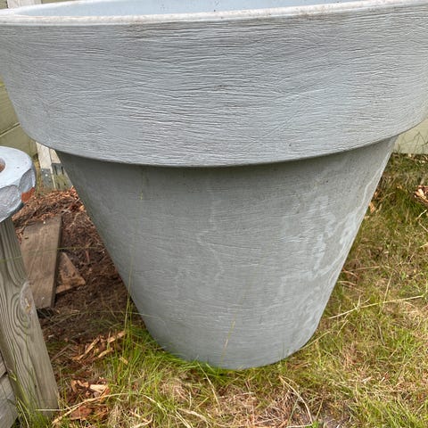 Rottinkinen iso ulkoruukku, jossa metallinen irrotettava istutusruukku. Korkeus 46 leveys 47 cm.