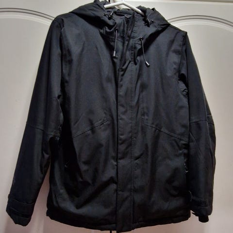 Hyväkuntoinen, käytetty toppatakki. Helmassa on lumilukot, hihat säädettävät. Huppu irroitettava sekä säädettävä. Kainaloissa vetoketjut. Vasemmassa hihassa löytyy esim. laskettelukorttia varten tasku. Koko 158/164