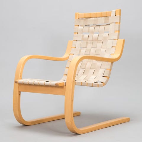 Artek Alvar Aalto nojatuoli vaaleaa koivua ja vaaleaa kangasta
