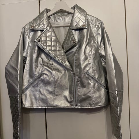 3XL kokoinen naisten takki mustassa värissä. Takki on valmistettu keinonahasta, hihat kiiltäväpintaista kangasta. Erikoismuotoillut hihat. Olkapäät jää avoimeksi. Takissa on napillinen etuosan sulkeminen. Feikki etutaskut. Käytetty kerran juhlissa ja todettu isoksi.