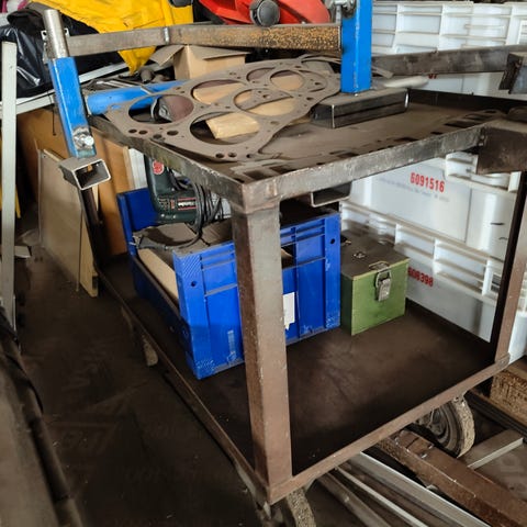Metalli työpöytä työpöydässä takalevy ettei tipu tavarat alle löytyy teline mihin saa vaikka työkaluja pöydässä ruuvipenkki ja mahdollista kiinnittää tukevasti lattiaan täyttä metallia painaa paljon kestää kovaa käyttöä