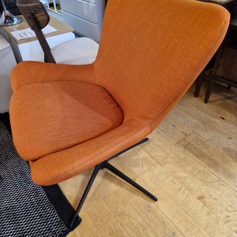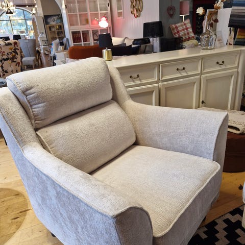 Uudenveroinen nojatuoli, jossa kaunis kaareva muotoilu. Harmahtava kangas.