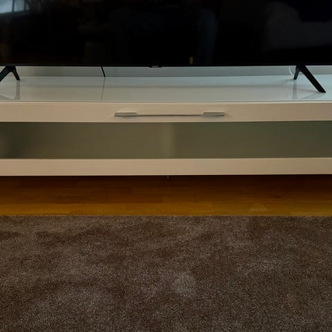 Iskun tv-taso, kaksi laatikkoa, kaksi lasiliukuovea.