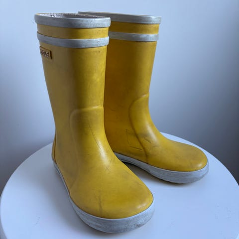 Hauskat Aiglen siniset kumisaappaat koko 25. Hyvä joustava pohja, ei kantakorkoa. Kompromissikumpparit, sopii hyvin paljasjalkakenkiä pitäville. Kulumaa näkyvissä, mutta ehjät ja käyttökelpoiset ovet edelleen.