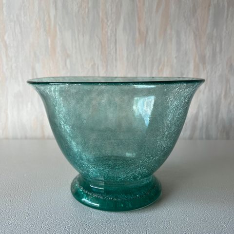 Jalallinen lasimalja. Halkaisija 15,5 cm, korkeus 14 cm. Jalan leveys 8 cm,
