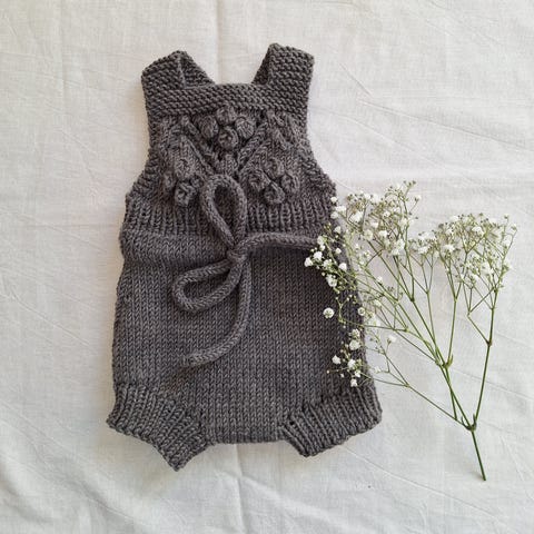Kaunis ja pehmeä merinovillainen romper. Uusi, itse neulottu. Neulottu superwash merinosta, joten kestää konepesun 40°C. Takana napit henkseleille. Koko 56/62.