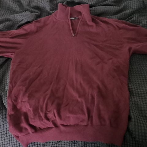 Viininpunainen Dressmann collegepaita. Koko 3XL, vastaa mielestäni numeroa pienempää. Edestä kaksi ihan pientä reikää paikattu, todella huomaamattomasti ja siististi. Alareunassa pieni haalea tahra.