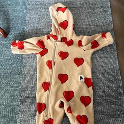 Mini Rodini Unisex fleecehaalari, koko 68, beige väriltään ja punaisilla sydänkuvioilla. Valmistettu pehmeästä fleecemateriaalista, joka tarjoaa lämpöä ja mukavuutta. Haalarissa on vetoketju edessä helpottamassa pukemista. Soveltuu lapsille ja tarjoaa suojaa viileämmiltä säiltä.ostettu uutena. Ollut vähäsellä käytöllä kun vauva vielä ei kävellyt. Mainin vielä että mini rodini koot on vähä isommat, niin kasvun varaa on.