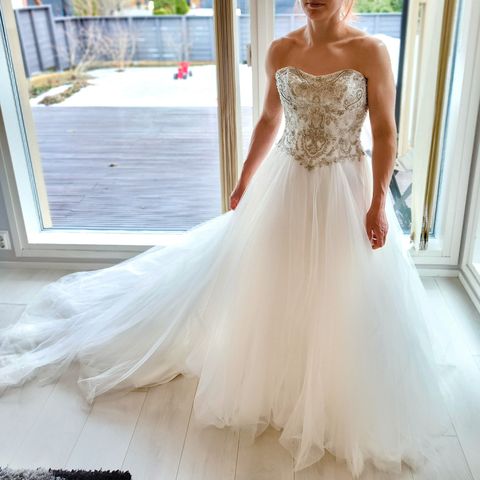 Ei ns. raskausmekko, vaan muokattu tavallisesta puvusta sopivaksi. Puku on muokattu keskivartalon kohdalta ainoastaan sivusaumoista löysäämällä, joten tämä on helppo muokata omalle vartalolle sopivaksi. Kylkien kohdalla olleet nyörit/tupsut on leikattu irti. Lyhennetty 160cm pituiselle, jolla 8cm korot. Pesetetty ammattipesulassa.