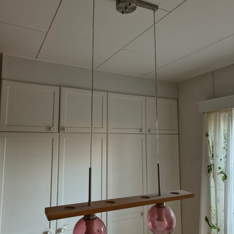 A large and beautiful ceiling lamp with a large smoke-colored glass, a stylish fabric cord and a brass-colored lamp holder. Suitable for e.g. above a kitchen table or kitchen island or in the living room. Bulb E27 included.