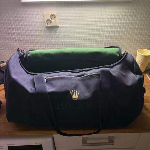 Myydään esim.vapaa ajan käyttöön tarkoitettu uusi käyttämätön Rolex merkkinen kassi.hienoja yksityikohtia. väri Tumman sininen pituus 60 cm.syvyys 34cmja leveys35cm . paikan päältä ja käteisellä.