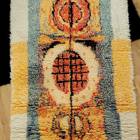 Siisti, hyväkuntoinen tuuhea ryijy. Mitat: l 105 ja p 165.