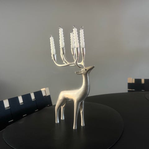 Uusi Pentik poro hopeoitu kynttelikkö 24 cm. Avaamattomassa lahjapakkauksessa, jossa kori ja 12 kpl tuohuskynttilöitä.