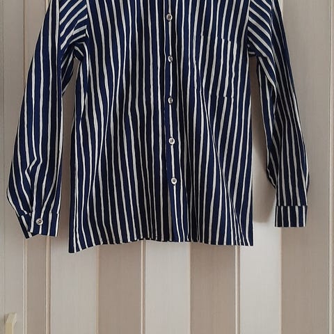 Myynnissä hyväkuntoinen Marimekon Jokapoika paita. Väri tumman sininen, raidat vihertävä sininen