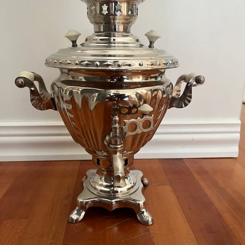 Sähköinen kolmen litran samovaari. Korkeus 33 cm halk. Kannesta mitattuna 18 cm. Johdosta päätellen olisko koskaan käytetty. Paino noin. 2,5 kg