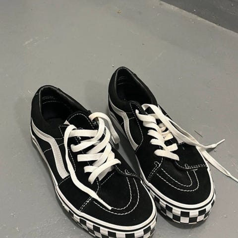 Vans tennarit koossa 38 (sisämitta 24 cm). Kengät ovat mustavalkoiset, joissa on ruutukuvio ja päivänkakkara kukkakuvioita. Materiaalina on kangas. Kengät ovat slip-on-mallia ilman nauhoja.