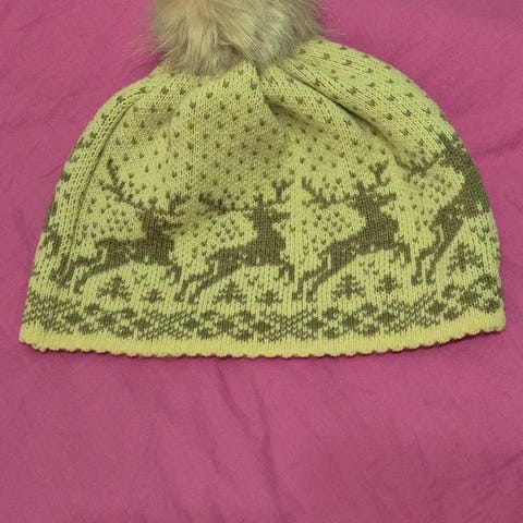 Viitassa ei ole materiaalimerkintöjä/ valmistajanmerkintää. Ehkä polyesteriä, villaisen tuntuinen ja lämmin. Hapsut helmassa.