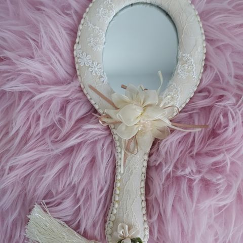 Vanha käsipeili ja harja koristeeksi. Vihreät koristepahvit tarvitsee tipan liimaa, sillä luiskahtavat helposti paikoiltaan.