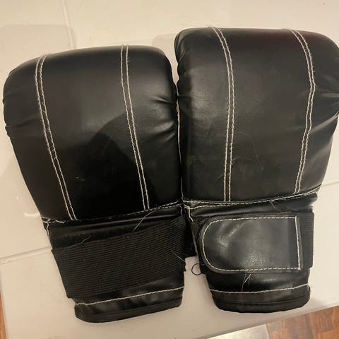 Vähän käytetyt Energetics Nyrkkeilyhanskat, koko 12, 08-Oz, valmistettu mustasta nahasta. Tarrakiinnitys ranteessa.