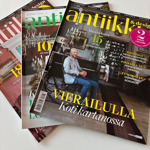 Antiikki ja designe lehtiä vuosilta 2001-2025, jokunen aina kultakin vuodelta. Löytyy lämminvarastosta lisää. Muuton yhteydessä talosta osaketaloon, niitä piti kannella moneen paikkaan. Nyt kun on pakkasia ja on pimeät illat mikäs sen mukavampaa kuin istua mukavasti sohvan kulmassa shaali harteilla ja tehdä sisustus suunnitelmia noista upeista antiikkia pursuavista lehdistä. Itse ollut vakio tilaajana jo ennen 2000 lukua.