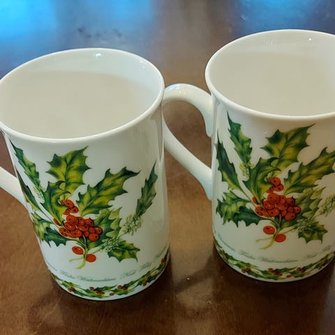 Kuusi posliinikuppia ja pieni kulho.
