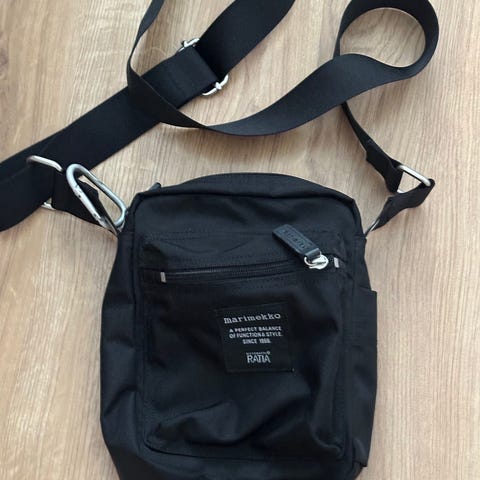 Hyvässä kunnossa Marimekko laukku.Jodskin muutama pieni valkoiset pilkut.Ja hihnassa kangas vika,kuvat on.