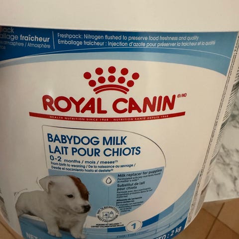 Paketti Royal Canin koiranmaitovastiketta. Mukana 3 arvaamatonta ja yksi avattu pussi maitojauhetta. Lisäksi tuttipullo, mittalusikka ja ohjeet. Meillä ei ollutkaan tarvetta näille.