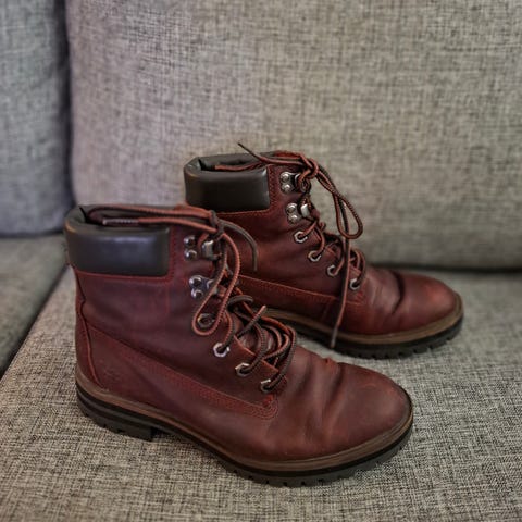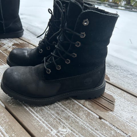 Timberland naisten nahkakengät kokoa 7 1/2 (vastaa noin kokoa 38 1/2). Väriltään perus Timberlandeja hieman tummemmat. Käytetty jonkun verran, mutta pohjat edelleen hyvässä kunnossa ja muutenkin pidetty ns. parempina kenkinä. Toisessa kengässä kärjessä pieniä kolhuja, mutta yleisilme näissä edelleen siisti ja mielestäni livenä näyttävät parempikuntoisilta kuin kuvassa.