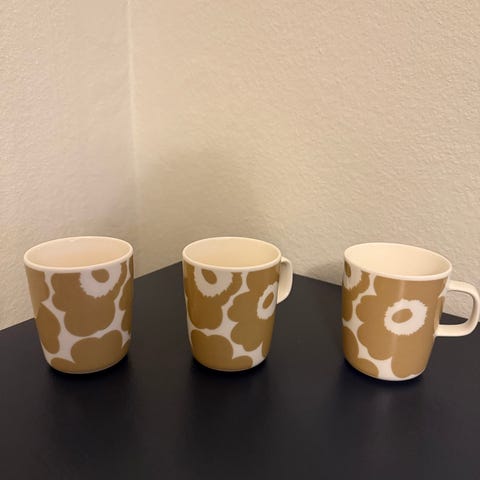 Myyn käyttämättömät Oiva / Siirtolapuutarha / Räsymatto teekupit 2,5 dl (2 kpl) sekä Oiva / Unikko mukin 2,5 dl (alle 5 käyttökertaa) yhteishintaan 36 e.