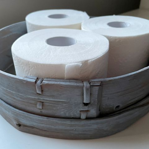 Käsityömarkkinoilta ostettu Molla -WC-paperiteline/ talouspaperiteline.