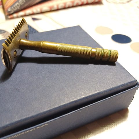 Menneiden aikojen tunnelmaa kylppäriin. Rasia ruostunut mutta parranajolaite erinomaisessa kunnossa. Tuskin käytetty ? Mukaan avaamaton paketti teriä. Sopii miesten parranajoon. Gillette. Vintage.