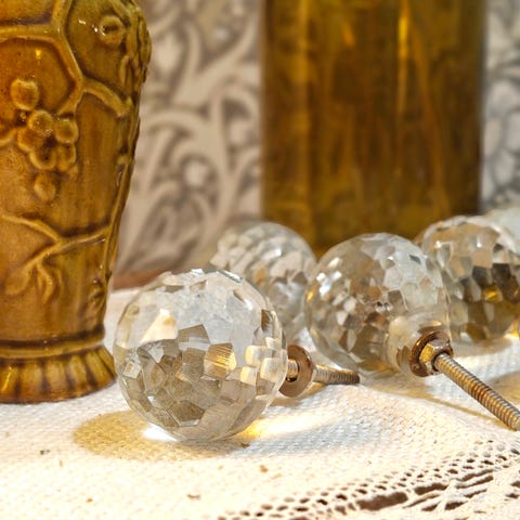 Näyttävä laatikon vedin. Lasinuppi metallikehyksellä. Metalliosan mitat 8x5cm. Nupin halkaisija 6cm, korkeus 5,7cm.