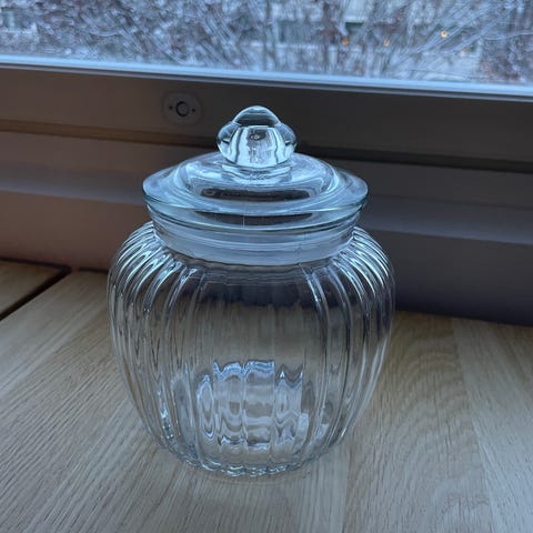 Lasipurkki, ei kantta. Meillä ollut käytössä häissä. Sopii myös karkkibuffetiin.