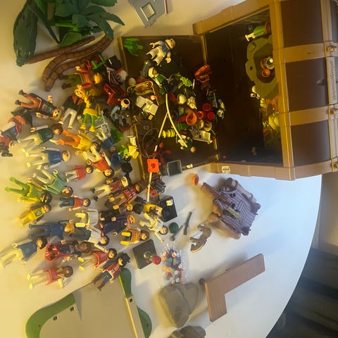 Laatikollinen Playmobil leluja ja rakennusosia sisältävä kokoelma, jossa on erilaisia hahmoja, rakennuselementtejä ja lisävarusteita. Sopii lasten leikkeihin ja rakenteluun. Mm. Länkkäri kylä.