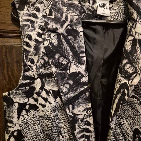Eläväpintaibe kangas. Pituus olkapäältä helmaan 72 cm. Mitta kainalosta kainaloon selästä mitattuna 51 cm.