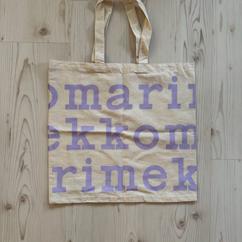 Marimekko kangaskassi, logokassi. Syksyn yksi uusi logokasseista. Kirjaimet liila / laventeli värisiä. Sopii unisex-käyttöön. Tilava kangaskassi. Nouto Asola Vantaa. Treffit Myyrmäki, pasila, helsinki. Postit 6€ posti. Toridiili ok