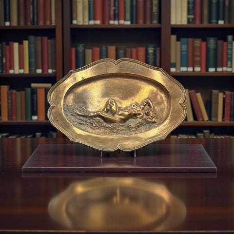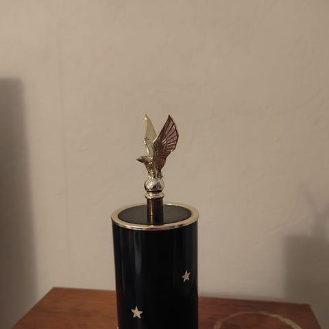 Patinoitunut uushopeinen mustekynälle tarkoitettu kynäkaukalo/pöytäessee.