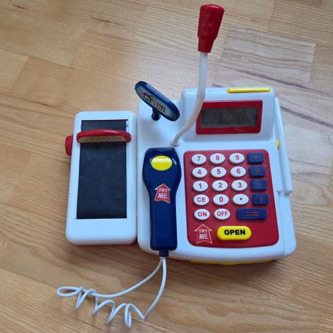 Myydään kuvan osittain puinen lelukassakone. Näppäimistö on paristoilla toimiva laskin jolla voi oikeasti laskea. Sivulla olevat kuvapainikkeet pitävät ääntä painettaessa. Sinisessä kassalippaassa voi säilyttää leikkirahaa. Vähäisiä käytön jälkiä. Ehjä ja toimiva. Sisältää paristot, ei kuitenkaan uudet.
