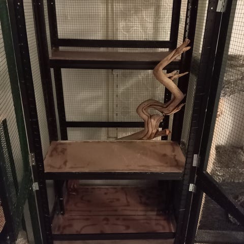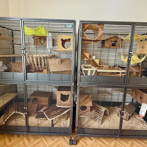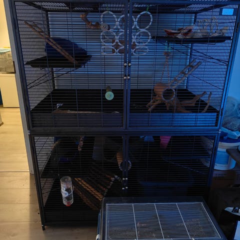Meillä chinchilloilla ja rotilla monta vuotta käytössä ollut häkki. Muoviset pohjat ja tasot saa mukaansa. Osittain ruostunut, eikä mikään kedon kaunein kukkanen mutta ajaa asiansa loistavasti! Yhden pyörän tästä onnistuin rikkomaan.